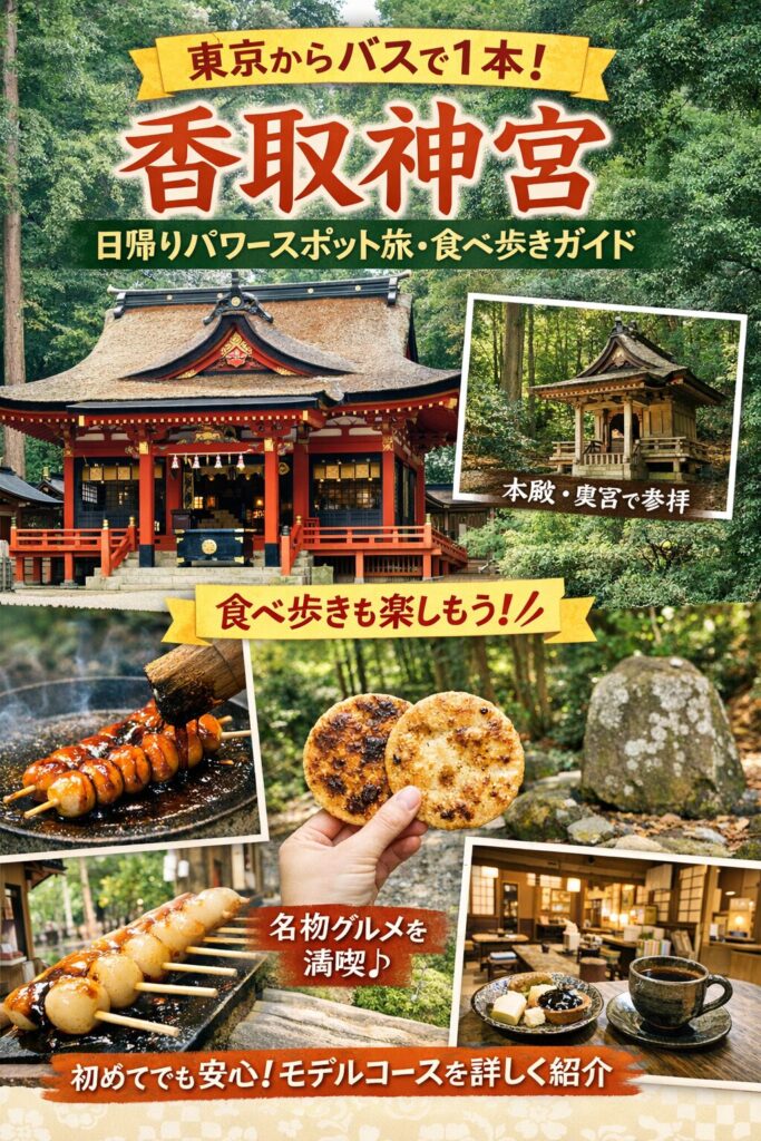 【大人の遠足】東京から2時間!鹿島神宮でパワーチャージ!ぷらりグルメ旅東京からバスで2時間!ゲッターズ飯田さんも推奨する最強パワースポット「鹿島神宮」を徹底レポ。参道の絶品大判焼きや御手洗池のお団子など、食べ歩きグルメも満喫!1人旅や日帰り遠足にぴったりの見どころと、東京駅からの行き方を分かりやすく解説します。...