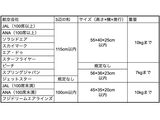 ただし、航空会社によって機内持ち込みのサイズや重量のルールは違うので注意が必要です!